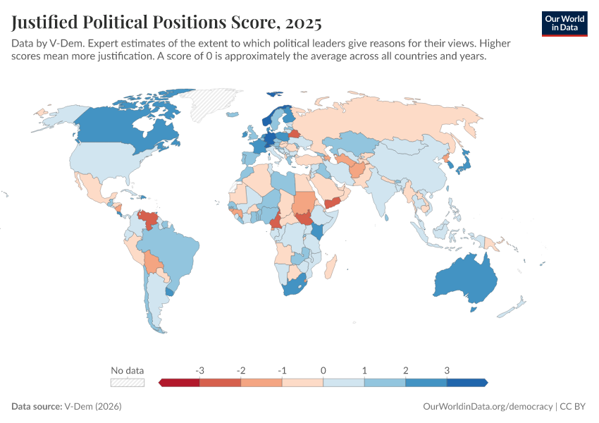 “Data Page: Justified political positions”, part of the following publication: Bastian Herre, Lucas Rodés-Guirao, and Esteban Ortiz-Ospina (2013) - “Democracy”. Data adapted from V-Dem. Retrieved from https://select-date-by-typing.owid.pages.dev/grapher/justified-political-positions-score [online resource]How to cite this data