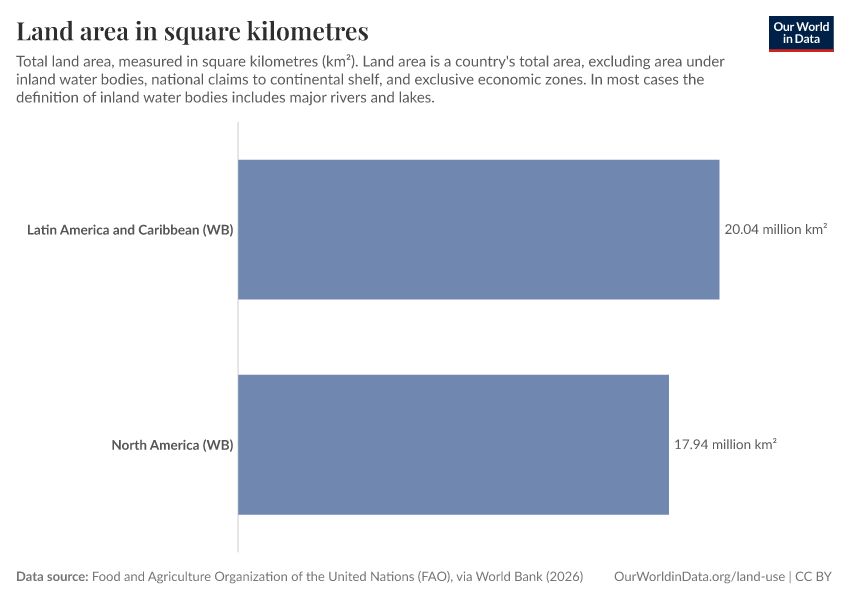 Food and Agriculture Organization of the United Nations (FAO), via World Bank (2025) – processed by Our World in Data. “Land area in square kilometres” [dataset]. Food and Agriculture Organization of the United Nations (FAO), via World Bank, “World Development Indicators 122” [original data]. Retrieved January 6, 2026 from https://select-date-by-typing.owid.pages.dev/grapher/land-area-km
