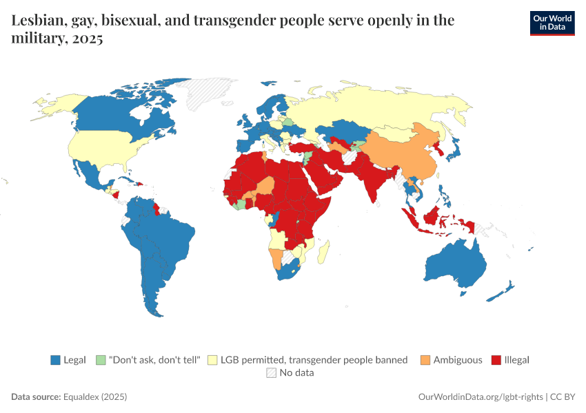 “Data Page: Lesbian, gay, bisexual, and transgender people serve openly in the military”, part of the following publication: Bastian Herre and Pablo Arriagada (2023) - “LGBT+ Rights”. Data adapted from Equaldex. Retrieved from https://select-date-by-typing.owid.pages.dev/grapher/lgbt-military-equaldex [online resource]How to cite this data