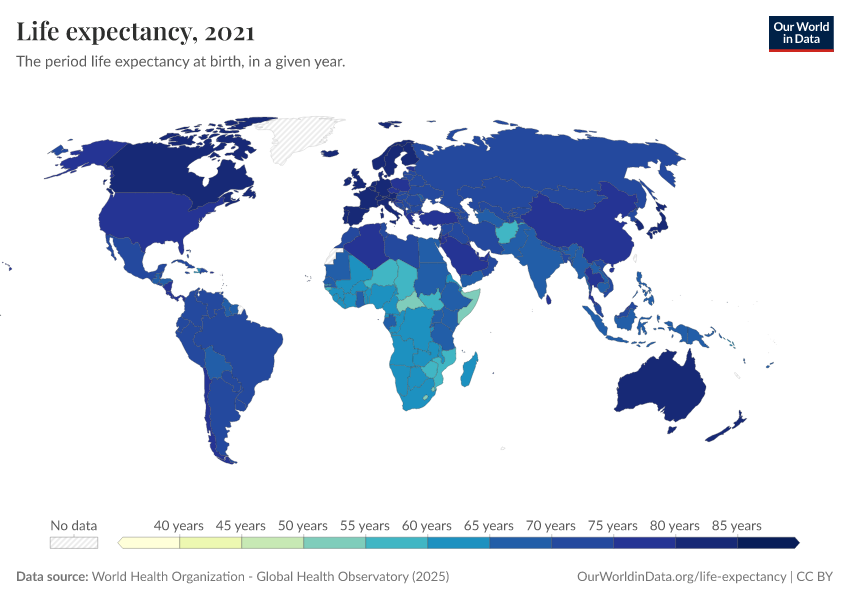 World Health Organization - Global Health Observatory (2025) – processed by Our World in Data. “Life expectancy” [dataset]. World Health Organization, “Global Health Observatory” [original data]. Retrieved January 6, 2026 from https://select-date-by-typing.owid.pages.dev/grapher/life-expectancy-at-birth-who-gho