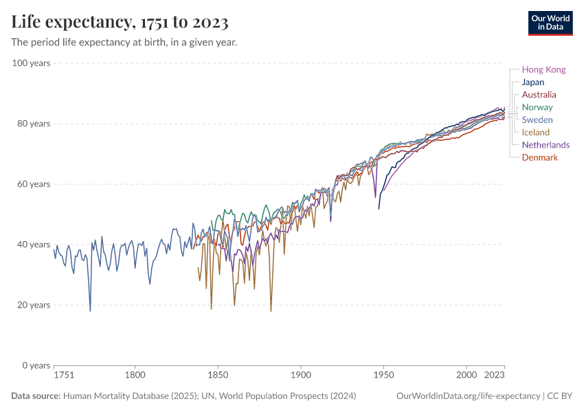 Human Mortality Database (2025); UN, World Population Prospects (2024) – processed by Our World in Data. “Life expectancy at birth – HMD – totals, period tables” [dataset]. Human Mortality Database, “Human Mortality Database”; United Nations, “World Population Prospects” [original data]. Retrieved January 6, 2026 from https://select-date-by-typing.owid.pages.dev/grapher/life-expectancy-hmd-unwpp