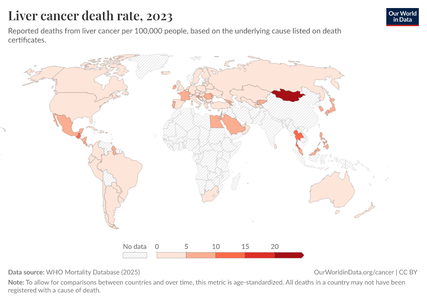 “Data Page: Liver cancer death rate”, part of the following publication: Saloni Dattani, Fiona Spooner, Hannah Ritchie, and Max Roser (2023) - “Causes of Death”. Data adapted from WHO Mortality Database. Retrieved from https://select-date-by-typing.owid.pages.dev/grapher/liver-cancer-death-rate [online resource]How to cite this data