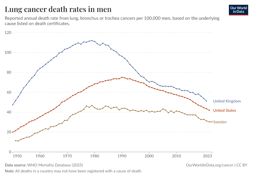 WHO Mortality Database (2025) – with minor processing by Our World in Data. “Lung cancer death rates in men” [dataset]. WHO Mortality Database, “WHO Mortality Database” [original data]. Retrieved January 6, 2026 from https://select-date-by-typing.owid.pages.dev/grapher/lung-cancer-death-rates-males