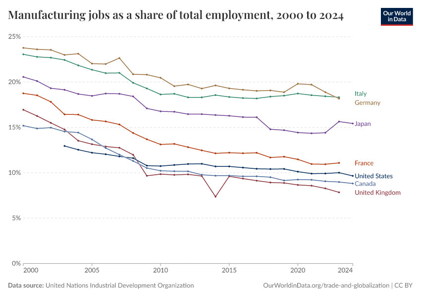 “Data Page: Manufacturing jobs as a share of total employment”. Our World in Data (2026). Data adapted from United Nations Industrial Development Organization. Retrieved from https://select-date-by-typing.owid.pages.dev/grapher/manufacturing-share-of-total-employment [online resource]How to cite this data