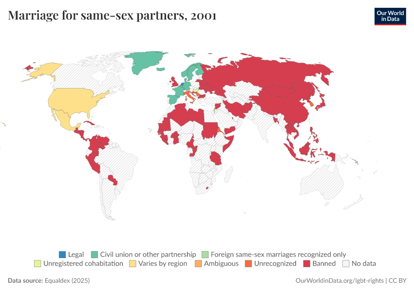 “Data Page: Marriage for same-sex partners”, part of the following publication: Bastian Herre and Pablo Arriagada (2023) - “LGBT+ Rights”. Data adapted from Equaldex. Retrieved from https://select-date-by-typing.owid.pages.dev/grapher/marriage-same-sex-partners-equaldex [online resource]How to cite this data