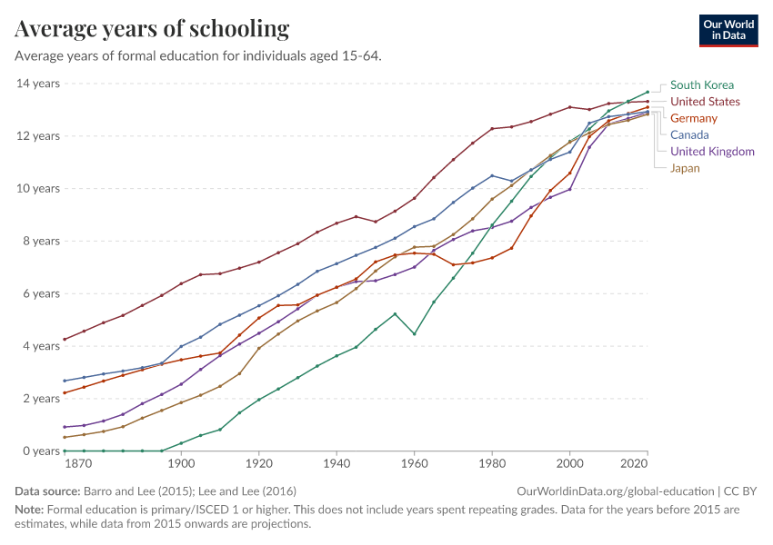 Barro and Lee (2015); Lee and Lee (2016) – with major processing by Our World in Data. “Average years of schooling” [dataset]. Barro and Lee, “Projections of Educational Attainment”; Lee and Lee, “Human Capital in the Long Run” [original data]. Retrieved January 6, 2026 from https://select-date-by-typing.owid.pages.dev/grapher/mean-years-of-schooling-long-run