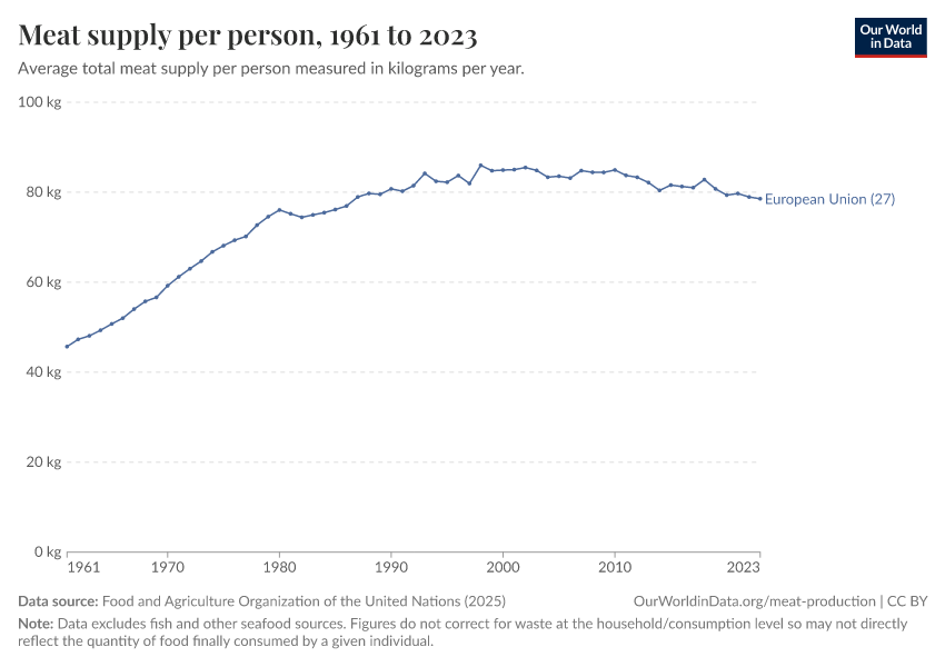 Food and Agriculture Organization of the United Nations (2024) – processed by Our World in Data. “Yearly per capita supply of all meat” [dataset]. Food and Agriculture Organization of the United Nations, “Food Balances: Food Balances (-2013, old methodology and population)”; Food and Agriculture Organization of the United Nations, “Food Balances: Food Balances (2010-)” [original data]. Retrieved January 6, 2026 from https://select-date-by-typing.owid.pages.dev/grapher/meat-supply-per-person
