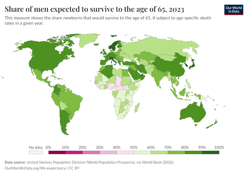 “Data Page: Share of men expected to survive to the age of 65”. Our World in Data (2026). Data adapted from United Nations Population Division (World Population Prospects), via World Bank. Retrieved from https://select-date-by-typing.owid.pages.dev/grapher/men-survival-to-age-65 [online resource]How to cite this data