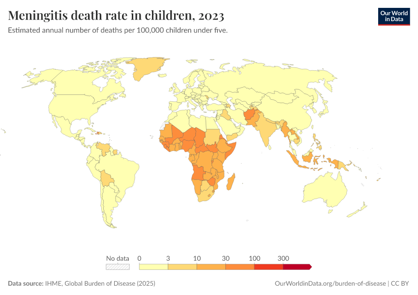 IHME, Global Burden of Disease (2024) – with minor processing by Our World in Data. “Meningitis death rate in children” [dataset]. IHME, Global Burden of Disease, “Global Burden of Disease - Deaths and DALYs” [original data]. Retrieved January 6, 2026 from https://select-date-by-typing.owid.pages.dev/grapher/meningitis-death-rates-children-under-5
