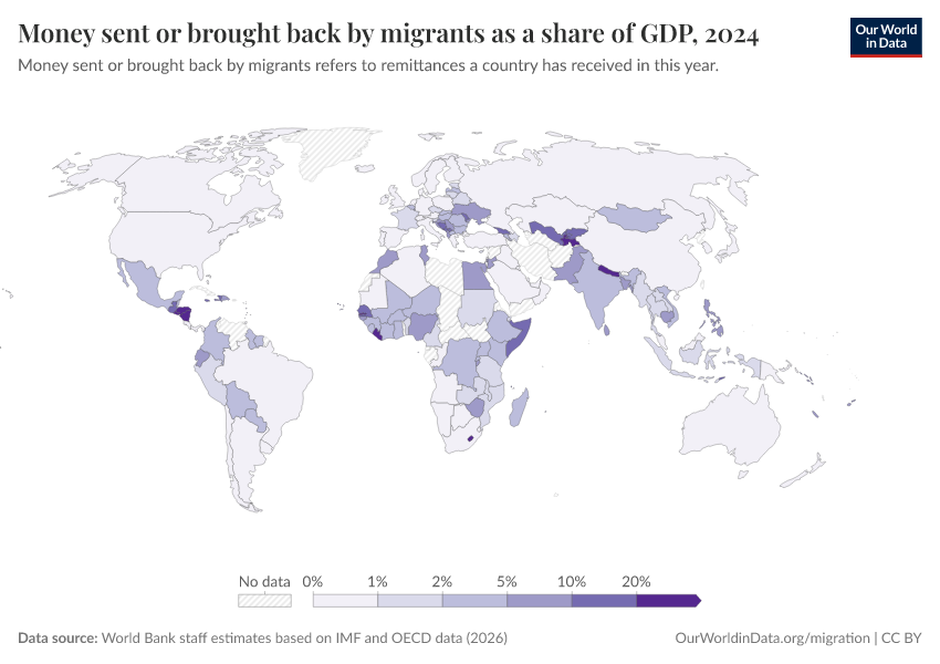 “Data Page: Money sent or brought back by migrants as a share of GDP”. Our World in Data (2026). Data adapted from World Bank staff estimates based on IMF and OECD data. Retrieved from https://select-date-by-typing.owid.pages.dev/grapher/money-sent-or-brought-back-by-migrants-as-a-share-of-gdp [online resource]How to cite this data