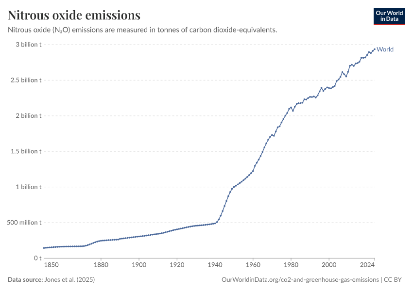 Jones et al. (2024) – with major processing by Our World in Data. “Annual nitrous oxide emissions including land use” [dataset]. Jones et al., “National contributions to climate change 2024.2” [original data]. Retrieved January 6, 2026 from https://select-date-by-typing.owid.pages.dev/grapher/nitrous-oxide-emissions