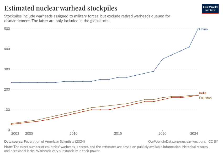 “Data Page: Estimated nuclear warhead stockpiles”, part of the following publication: Bastian Herre, Pablo Rosado, and Max Roser (2024) - “Nuclear Weapons”. Data adapted from Federation of American Scientists. Retrieved from https://select-date-by-typing.owid.pages.dev/grapher/nuclear-warhead-stockpiles-lines [online resource]