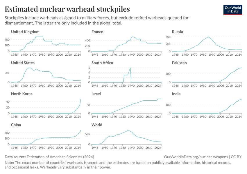 Federation of American Scientists (2024) – with minor processing by Our World in Data. “Estimated nuclear warhead stockpiles” [dataset]. Federation of American Scientists, “Estimated Global Nuclear Warhead Inventories” [original data]. Retrieved January 6, 2026 from https://select-date-by-typing.owid.pages.dev/grapher/nuclear-warhead-stockpiles-lines