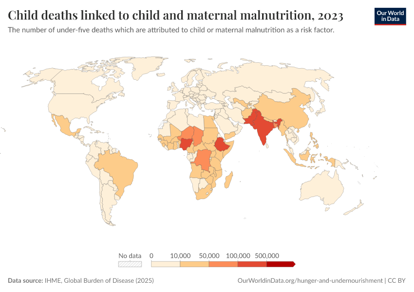 IHME, Global Burden of Disease (2024) – with minor processing by Our World in Data. “Child deaths linked to child and maternal malnutrition” [dataset]. IHME, Global Burden of Disease, “Global Burden of Disease - Risk Factors” [original data]. Retrieved January 6, 2026 from https://select-date-by-typing.owid.pages.dev/grapher/number-child-deaths-malnutrition