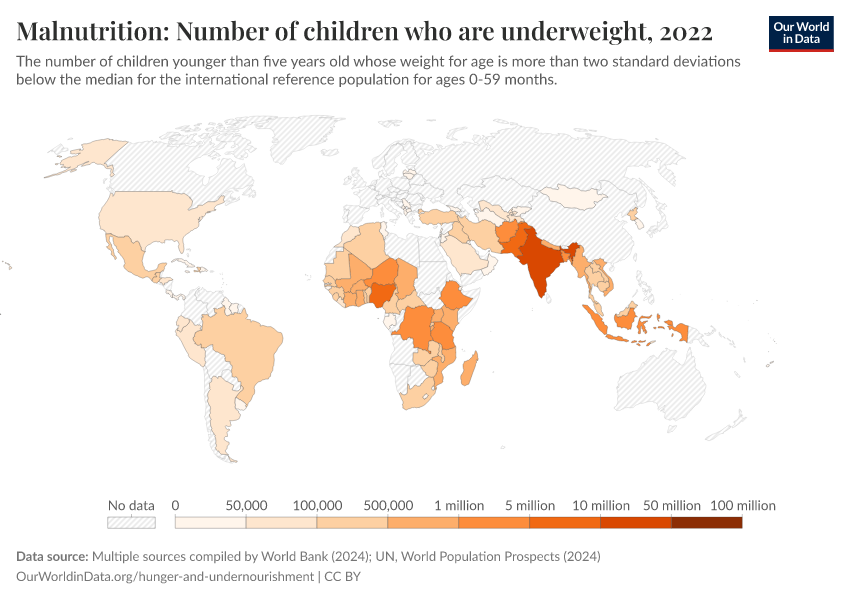 Multiple sources compiled by World Bank (2024); UN, World Population Prospects (2024) – processed by Our World in Data. “Number of underweight children – UN WPP” [dataset]. UNICEF, WHO, World Bank, “World Development Indicators”; United Nations, “World Population Prospects” [original data]. Retrieved January 6, 2026 from https://select-date-by-typing.owid.pages.dev/grapher/number-of-children-who-are-underweight
