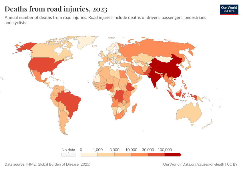 IHME, Global Burden of Disease (2024) – with minor processing by Our World in Data. “Deaths from road injuries” [dataset]. IHME, Global Burden of Disease, “Global Burden of Disease - Deaths and DALYs” [original data]. Retrieved January 6, 2026 from https://select-date-by-typing.owid.pages.dev/grapher/number-of-deaths-from-road-injuries