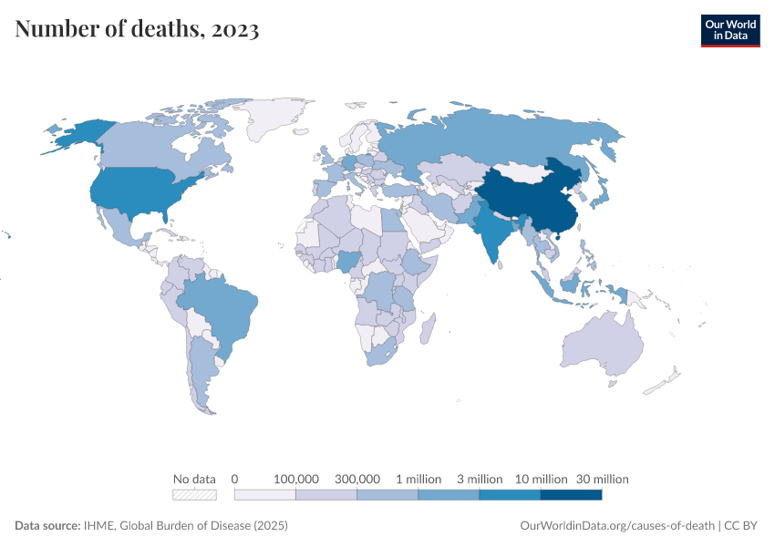 IHME, Global Burden of Disease (2024) – with minor processing by Our World in Data. “Number of deaths” [dataset]. IHME, Global Burden of Disease, “Global Burden of Disease - Deaths and DALYs” [original data]. Retrieved January 6, 2026 from https://select-date-by-typing.owid.pages.dev/grapher/number-of-deaths-gbd
