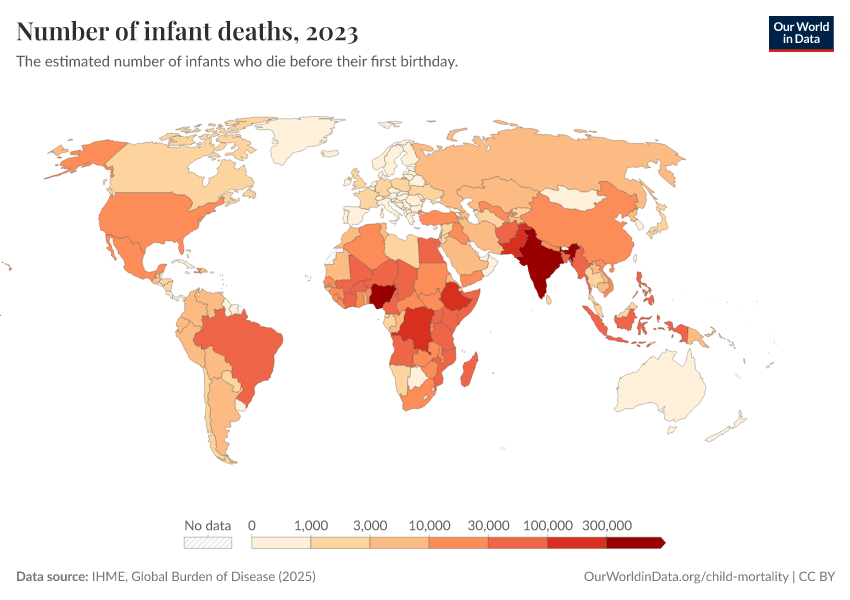 IHME, Global Burden of Disease (2024) – with minor processing by Our World in Data. “Number of infant deaths” [dataset]. IHME, Global Burden of Disease, “Global Burden of Disease - Child Mortality” [original data]. Retrieved January 6, 2026 from https://select-date-by-typing.owid.pages.dev/grapher/number-of-infant-deaths-ihme
