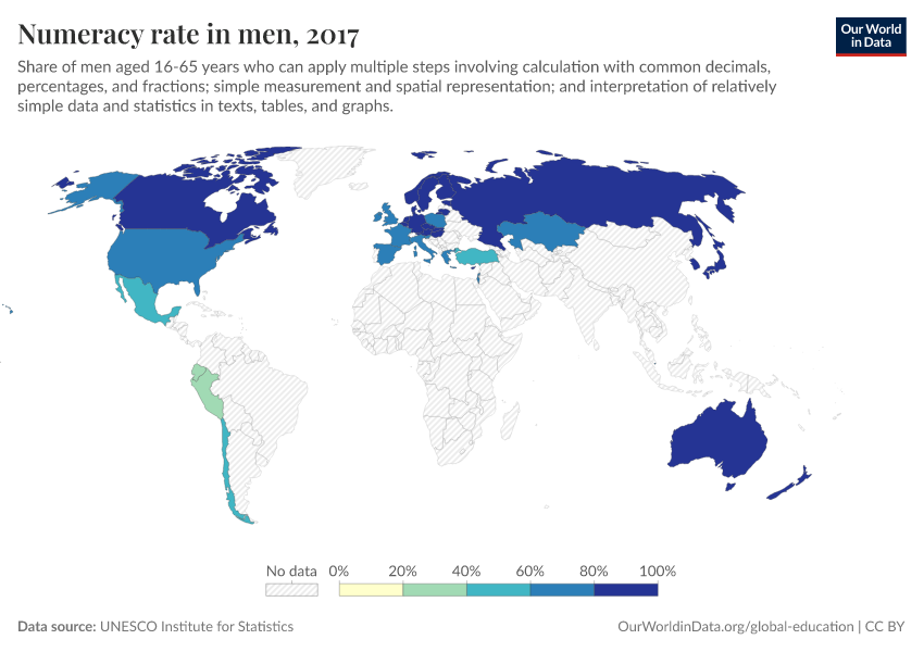 UNESCO Institute for Statistics – processed by Our World in Data. “Numeracy rate in men” [dataset]. UNESCO Institute for Statistics, “Data from multiple sources” [original data]. Retrieved January 6, 2026 from https://select-date-by-typing.owid.pages.dev/grapher/numeracy-rate-in-adult-men