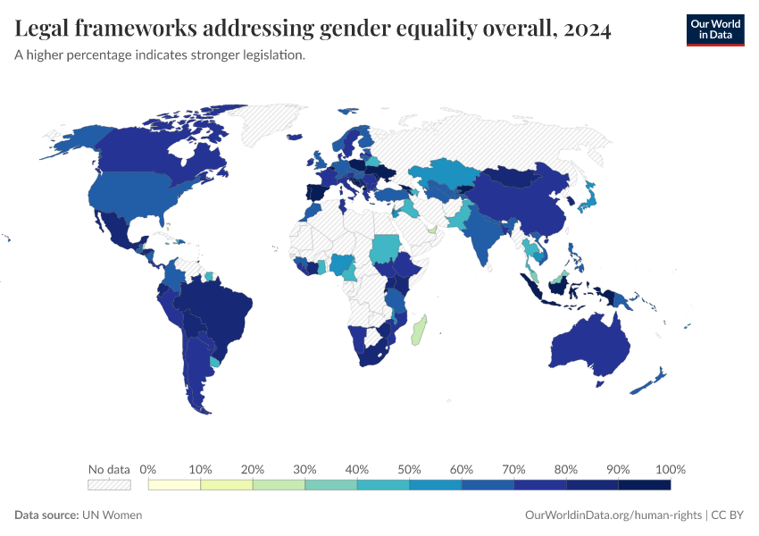 “Data Page: Legal frameworks addressing gender equality overall”. Our World in Data (2026). Data adapted from UN Women. Retrieved from https://select-date-by-typing.owid.pages.dev/grapher/overarching-legal-frameworks-regarding-gender-equality [online resource]How to cite this data