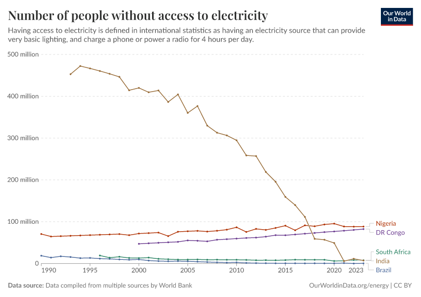 Data compiled from multiple sources by World Bank – with major processing by Our World in Data. “Number of people without access to electricity – World Bank” [dataset]. SDG 7.1.1 Electrification Dataset, World Bank, via World Bank, “World Development Indicators 122”; United Nations Population Division, national statistical offices, and Eurostat, via World Bank, “World Development Indicators 122” [original data]. Retrieved January 6, 2026 from https://select-date-by-typing.owid.pages.dev/grapher/people-without-electricity-country