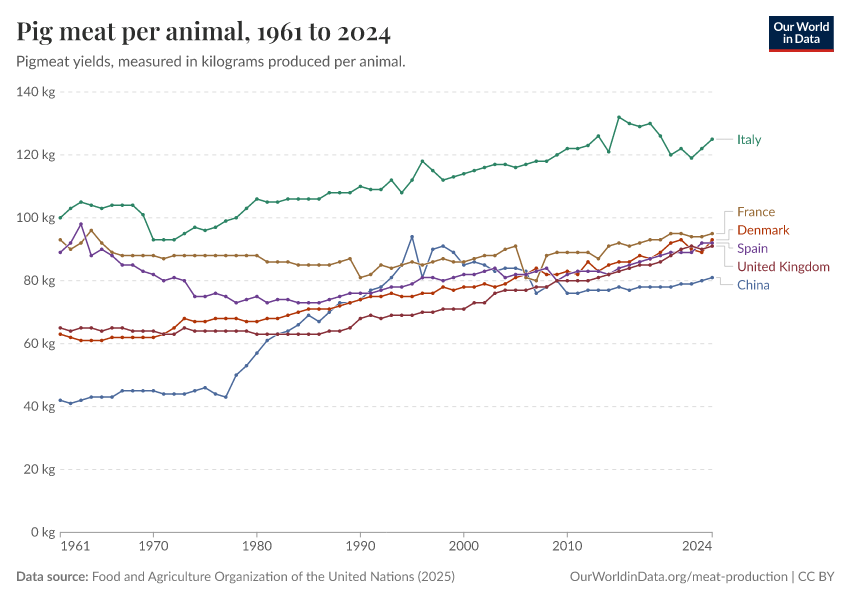 Food and Agriculture Organization of the United Nations (2025) – with major processing by Our World in Data. “Pig meat yield per animal – UN FAO” [dataset]. Food and Agriculture Organization of the United Nations, “Production: Crops and livestock products” [original data]. Retrieved January 6, 2026 from https://select-date-by-typing.owid.pages.dev/grapher/pig-yields-meat-per-animal-in-hectograms-100-grams