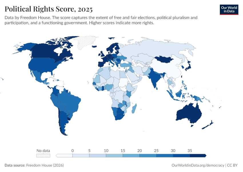 Freedom House (2025) – processed by Our World in Data. “Political rights score” [dataset]. Freedom House, “Freedom in the World” [original data]. Retrieved January 6, 2026 from https://select-date-by-typing.owid.pages.dev/grapher/political-rights-score-fh