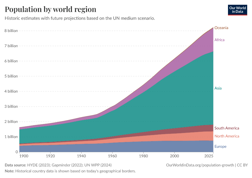 “Data Page: Population by world region”, part of the following publication: Hannah Ritchie, Lucas Rodés-Guirao, Edouard Mathieu, Marcel Gerber, Esteban Ortiz-Ospina, Joe Hasell, and Max Roser (2023) - “Population Growth”. Data adapted from PBL Netherlands Environmental Assessment Agency, Gapminder, United Nations. Retrieved from https://select-date-by-typing.owid.pages.dev/grapher/population-regions-with-projections [online resource]How to cite this data