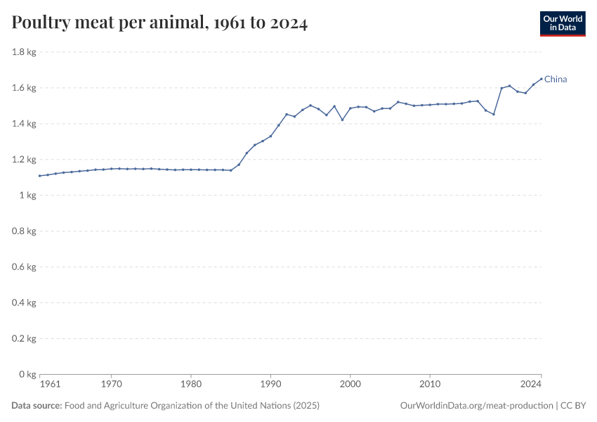 “Data Page: Poultry meat yield per animal”, part of the following publication: Hannah Ritchie, Pablo Rosado, and Max Roser (2023) - “Agricultural Production”. Data adapted from Food and Agriculture Organization of the United Nations. Retrieved from https://select-date-by-typing.owid.pages.dev/grapher/poultry-yields-meat-per-animal [online resource]How to cite this data