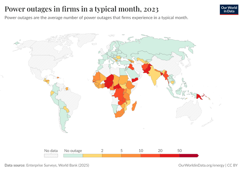 “Data Page: Power outages in firms in a typical month”. Our World in Data (2026). Data adapted from Enterprise Surveys, World Bank. Retrieved from https://select-date-by-typing.owid.pages.dev/grapher/power-outages-in-firms-per-month [online resource]