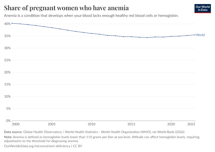 “Data Page: Share of pregnant women who have anemia”. Our World in Data (2026). Data adapted from Global Health Observatory / World Health Statistics - World Health Organization (WHO), via World Bank. Retrieved from https://select-date-by-typing.owid.pages.dev/grapher/prevalence-of-anemia-in-pregnant-women [online resource]How to cite this data