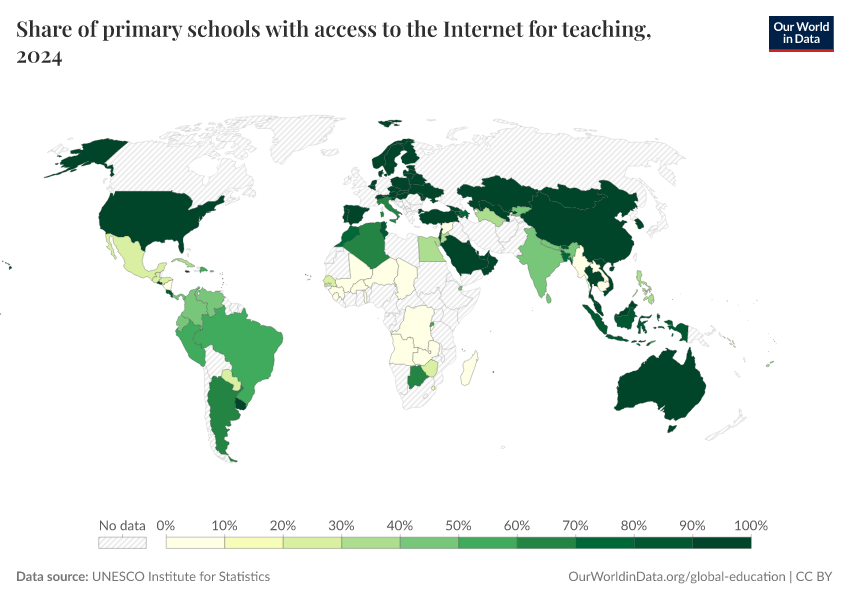 “Data Page: Share of primary schools with access to the Internet for teaching”. Our World in Data (2026). Data adapted from UNESCO Institute for Statistics. Retrieved from https://select-date-by-typing.owid.pages.dev/grapher/primary-schools-with-access-to-internet [online resource]How to cite this data