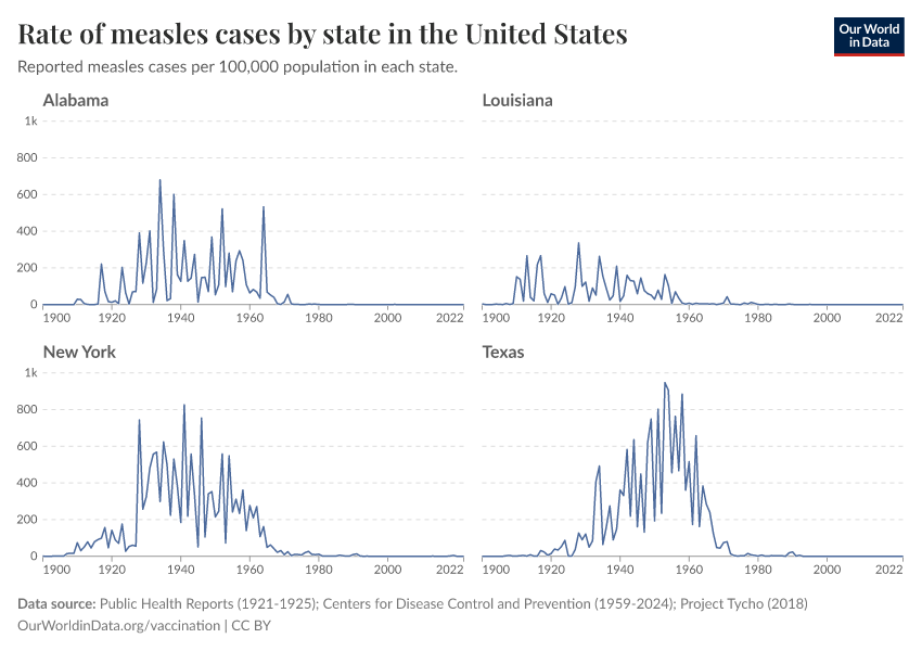 Public Health Reports (1921-1925); Centers for Disease Control and Prevention (1959-2024); Project Tycho (2018) – with major processing by Our World in Data. “Rate of measles cases by state in the United States” [dataset]. Project Tycho, “Project Tycho - Measles cases”; Centers for Disease Prevention and Control, “CDC Summary of Notifiable Infectious Diseases - Measles”; Centers for Disease Control and Prevention, “Reported measles cases - CDC”; Centers for Disease Control and Prevention, “National Notifiable Diseases Surveillance System - Measles”; U.S. Census Bureau, “Annual Estimates of the Population for each of the States in the USA” [original data]. Retrieved January 6, 2026 from https://select-date-by-typing.owid.pages.dev/grapher/reported-measles-case-rate-by-state-in-the-united-states