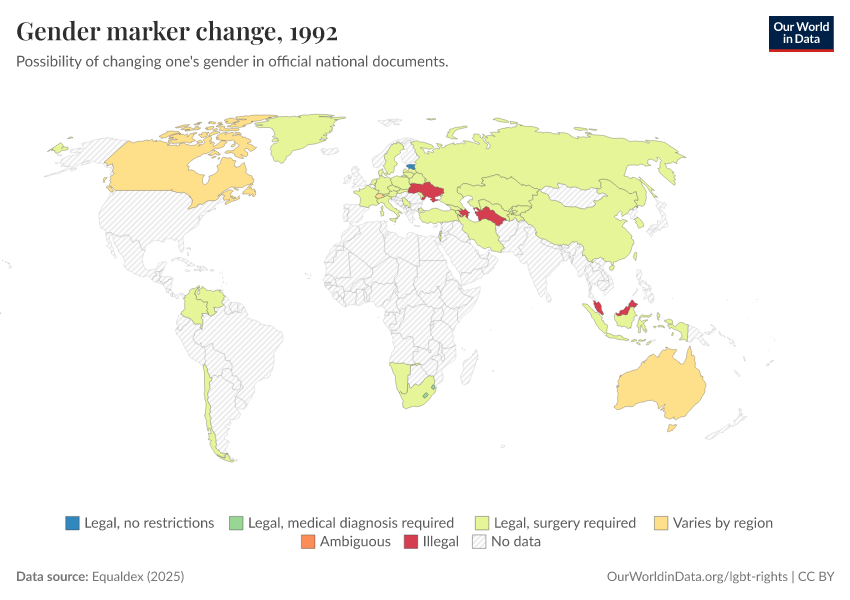 Equaldex (2025) – with major processing by Our World in Data. “Gender marker change” [dataset]. Equaldex, “Equaldex” [original data]. Retrieved January 6, 2026 from https://select-date-by-typing.owid.pages.dev/grapher/right-to-change-legal-gender-equaldex