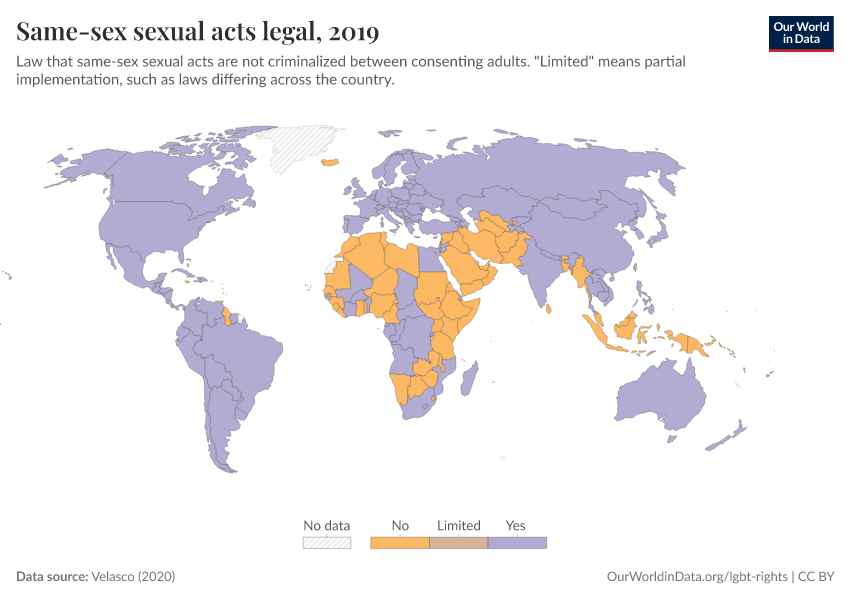 “Data Page: Same-sex sexual acts legal”, part of the following publication: Bastian Herre and Pablo Arriagada (2023) - “LGBT+ Rights”. Data adapted from Velasco. Retrieved from https://select-date-by-typing.owid.pages.dev/grapher/same-sex-sexual-acts-legal [online resource]How to cite this data