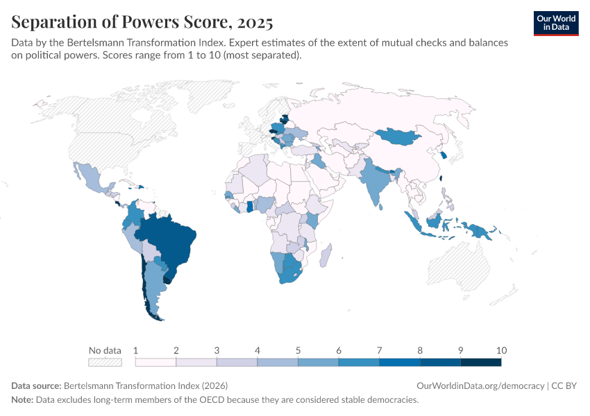 Bertelsmann Transformation Index (2024) – processed by Our World in Data. “Separation of powers score” [dataset]. Bertelsmann Transformation Index, “Bertelsmann Transformation Index, Scores” [original data]. Retrieved January 6, 2026 from https://select-date-by-typing.owid.pages.dev/grapher/separation-of-powers-score-bti
