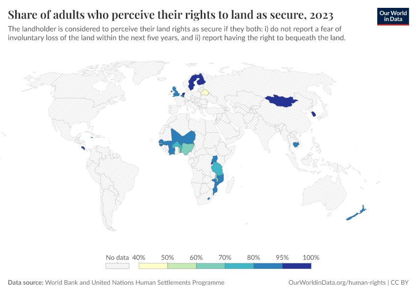 World Bank and United Nations Human Settlements Programme – processed by Our World in Data. “Share of adults who perceive their rights to land as secure” [dataset]. World Bank and United Nations Human Settlements Programme, “Data from multiple sources” [original data]. Retrieved January 6, 2026 from https://select-date-by-typing.owid.pages.dev/grapher/share-of-adults-who-perceive-their-rights-to-land-as-secure