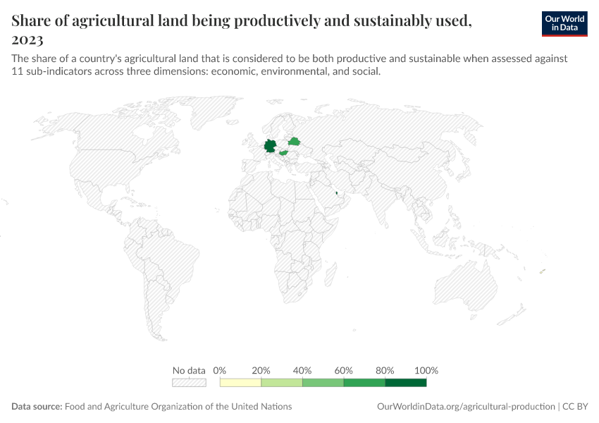 Food and Agriculture Organization of the United Nations – processed by Our World in Data. “Share of agricultural land being productively and sustainably used” [dataset]. Food and Agriculture Organization of the United Nations, “Data from multiple sources” [original data]. Retrieved January 6, 2026 from https://select-date-by-typing.owid.pages.dev/grapher/share-of-agricultural-land-being-productively-and-sustainably-used