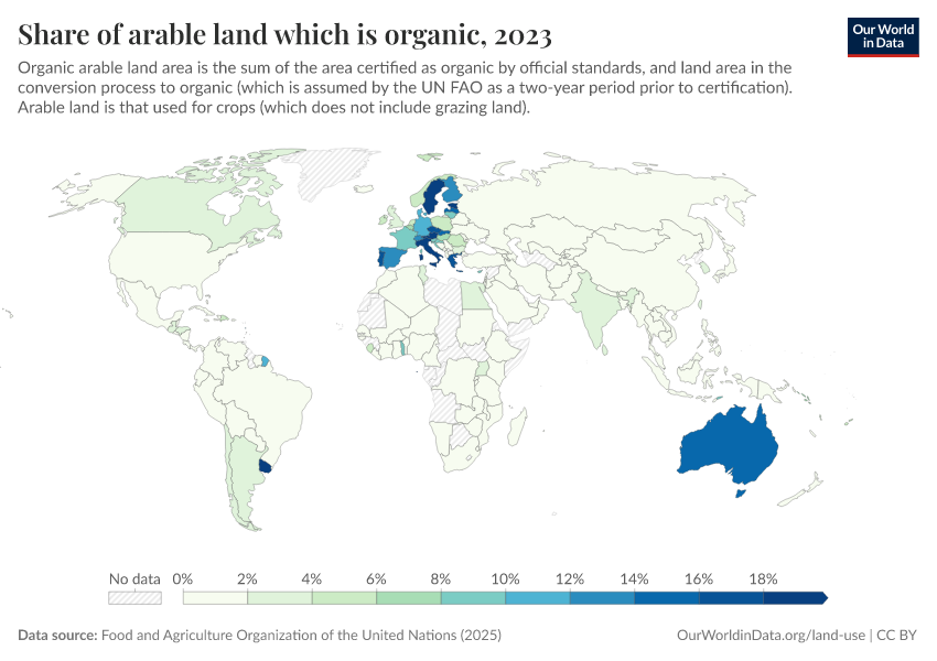 “Data Page: Share of arable land that is organic”, part of the following publication: Hannah Ritchie, Pablo Rosado, and Max Roser (2023) - “Agricultural Production”. Data adapted from Food and Agriculture Organization of the United Nations. Retrieved from https://select-date-by-typing.owid.pages.dev/grapher/share-of-arable-land-which-is-organic [online resource]How to cite this data