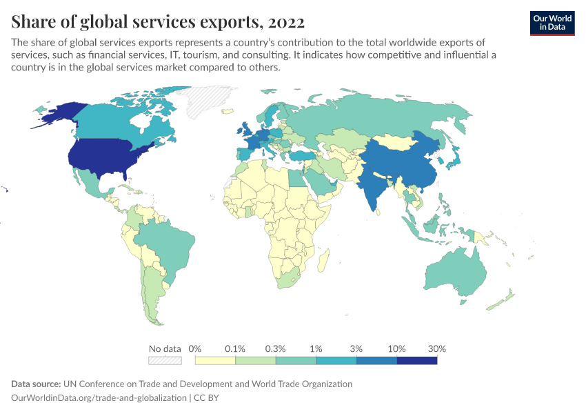 “Data Page: Share of global services exports”. Our World in Data (2026). Data adapted from UN Conference on Trade and Development and World Trade Organization. Retrieved from https://select-date-by-typing.owid.pages.dev/grapher/share-of-global-services-exports [online resource]How to cite this data