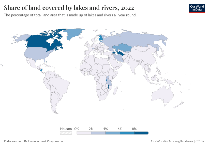 “Data Page: Share of land covered by lakes and rivers”. Our World in Data (2026). Data adapted from UN Environment Programme. Retrieved from https://select-date-by-typing.owid.pages.dev/grapher/share-of-land-covered-by-lakes-and-rivers [online resource]How to cite this data