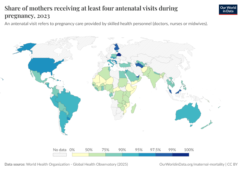 World Health Organization - Global Health Observatory (2025) – processed by Our World in Data. “Share of mothers receiving at least four antenatal visits during pregnancy” [dataset]. World Health Organization, “Global Health Observatory” [original data]. Retrieved January 6, 2026 from https://select-date-by-typing.owid.pages.dev/grapher/share-of-mothers-receiving-at-least-four-antenatal-visits-during-pregnancy