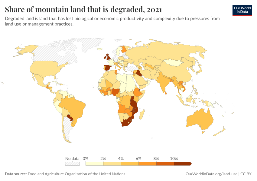 Food and Agriculture Organization of the United Nations – processed by Our World in Data. “Share of mountain land that is degraded” [dataset]. Food and Agriculture Organization of the United Nations, “Food and Agriculture Organization of the United Nations (FAO), South African National Biodiversity Institute (SANBI), Instituto Brasileiro de Geografia e Estatística (IBGE)” [original data]. Retrieved January 6, 2026 from https://select-date-by-typing.owid.pages.dev/grapher/share-of-mountain-land-that-is-degraded