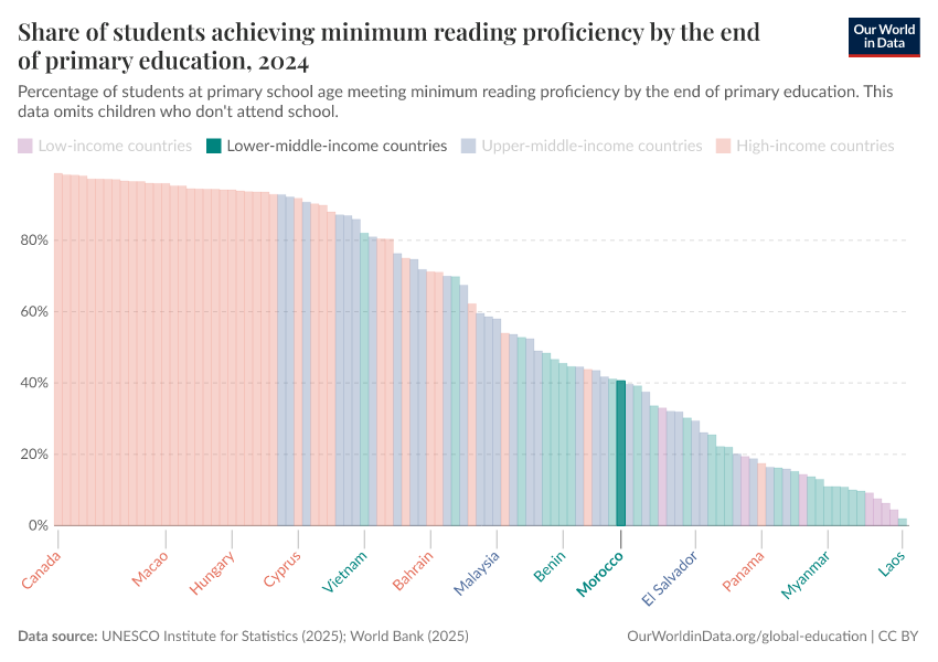 UNESCO Institute for Statistics (2025) – with minor processing by Our World in Data. “Share of students achieving minimum reading proficiency by the end of primary education” [dataset]. UNESCO Institute for Statistics, “UNESCO Institute for Statistics (UIS) - Education” [original data]. Retrieved January 6, 2026 from https://select-date-by-typing.owid.pages.dev/grapher/share-of-students-at-end-of-primary-education-achieving-minimum-reading-proficiency