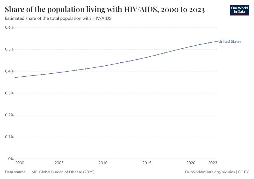 IHME, Global Burden of Disease (2024) – with major processing by Our World in Data. “Share of the population living with HIV/AIDS” [dataset]. IHME, Global Burden of Disease, “Global Burden of Disease - Prevalence and Incidence” [original data]. Retrieved January 6, 2026 from https://select-date-by-typing.owid.pages.dev/grapher/share-of-the-population-living-with-hivaids