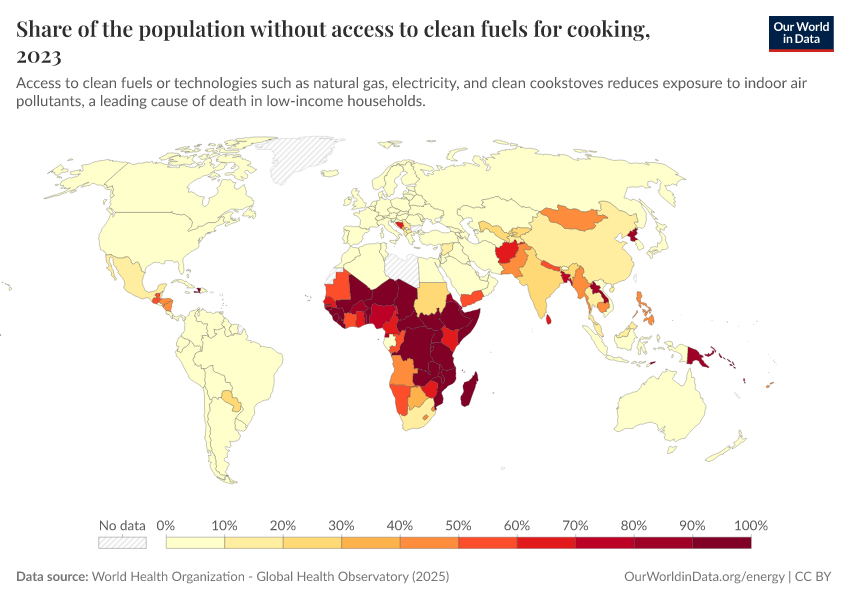 World Health Organization - Global Health Observatory (2025) – processed by Our World in Data. “Share of the population without access to clean fuels for cooking” [dataset]. World Health Organization, “Global Health Observatory” [original data]. Retrieved January 6, 2026 from https://select-date-by-typing.owid.pages.dev/grapher/share-of-the-population-without-access-to-clean-fuels-for-cooking