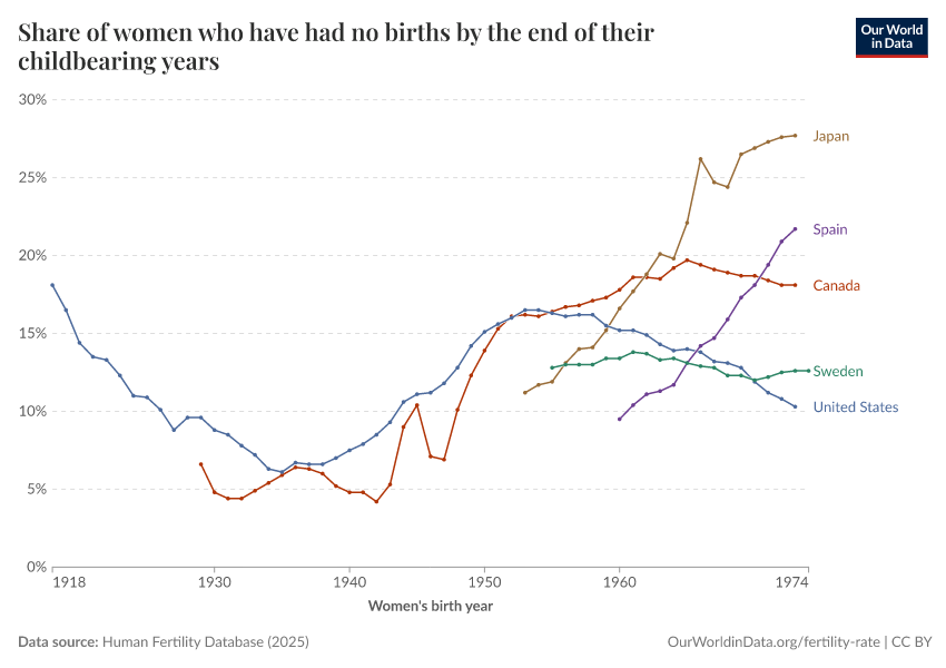 “Data Page: Share of women who have had no births by the end of their childbearing years”, part of the following publication: Saloni Dattani, Lucas Rodés-Guirao, and Max Roser (2025) - “Fertility Rate”. Data adapted from Human Fertility Database. Retrieved from https://select-date-by-typing.owid.pages.dev/grapher/share-of-women-who-have-had-no-births-across-their-childbearing-years [online resource]How to cite this data