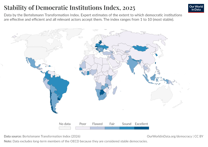 “Data Page: Stability of Democratic Institutions Index”, part of the following publication: Bastian Herre, Lucas Rodés-Guirao, and Esteban Ortiz-Ospina (2013) - “Democracy”. Data adapted from Bertelsmann Transformation Index. Retrieved from https://select-date-by-typing.owid.pages.dev/grapher/stability-democratic-institutions-index-bti [online resource]How to cite this data