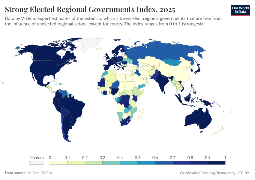 “Data Page: Elected regional governments”, part of the following publication: Bastian Herre, Lucas Rodés-Guirao, and Esteban Ortiz-Ospina (2013) - “Democracy”. Data adapted from V-Dem. Retrieved from https://select-date-by-typing.owid.pages.dev/grapher/strong-elected-regional-governments-index [online resource]How to cite this data