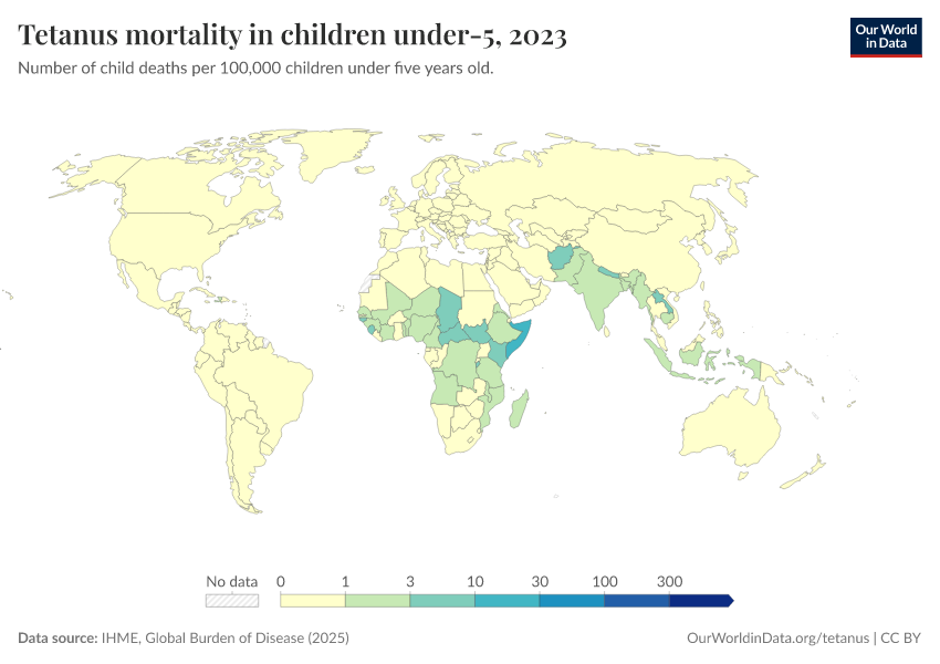 IHME, Global Burden of Disease (2024) – with minor processing by Our World in Data. “Tetanus mortality in children under-5” [dataset]. IHME, Global Burden of Disease, “Global Burden of Disease - Deaths and DALYs” [original data]. Retrieved January 6, 2026 from https://select-date-by-typing.owid.pages.dev/grapher/tetanus-mortality-in-children-under-5